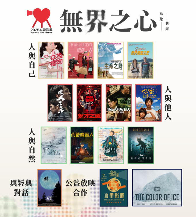 本屆影展將帶來15場精選電影,涵蓋「人與自己」、「人與他人」、「人與自然」、「與經典對話」及「公益放映合作」五大主題,期望帶領觀眾展開一場穿越內在與外在疆界的靈性旅程。影展不僅是觀看影像,更是一場打開感官與心靈的深層對話,讓觀眾在電影中感受彼此的共振、理解不同的存在,找回真正的連結與平衡。