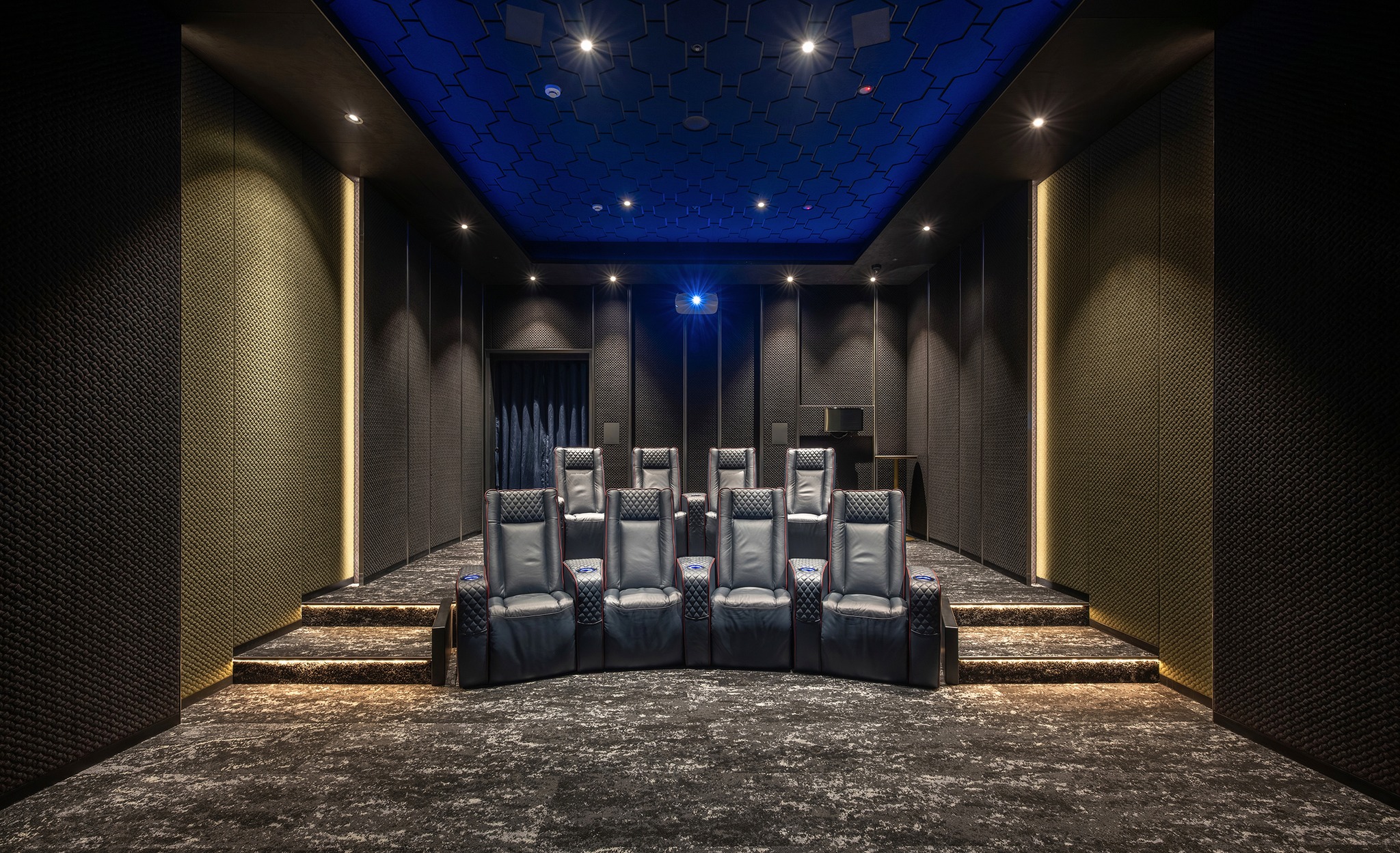 影城兼顧聲學、光影與座椅舒適度,打造全方位沉浸式觀影體驗。杜比全景聲Dolby Atmos搭配200吋電影院級透聲布,讓聲音層次渾厚而細緻。牆面採用80%高比例羊毛吸音繃布處理,天花板更是由220片鐳切吸音板交錯排列,配合藍色呼吸燈光,光影流動如電影膠卷,營造身歷其境的感受。而座椅則選用歐洲手工打造真皮劇院椅,除符合人體工學曲線具支撐性外,還另配備LED光環杯架與USB充電功能。每張座椅的弧形排列設計,也能確保每一席皆享最佳視野,如同影展首映的尊榮席次。